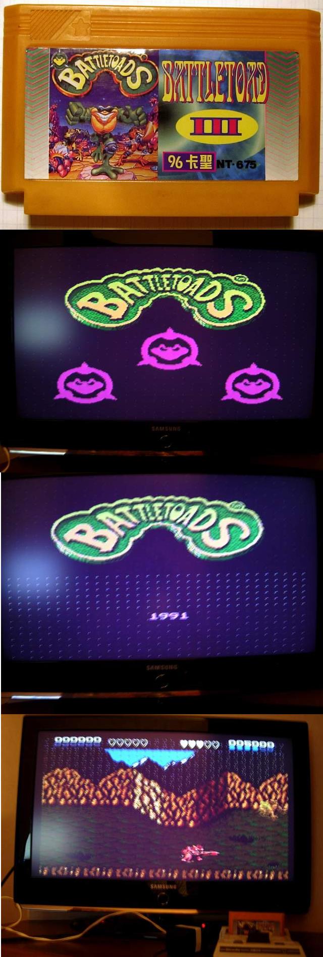 У меня ддома сейчас до сих пор лежит картридж 2 в 1 Battletoads 2 & Battletoads 3, могу заверить, как и EvGS, что реально это просто Battletoads & Double Dragon и Battletoads - соответственно. Единственное изменения которые я заметил при игре, это хаки. Так в Battletoads 2 вырезана заставка с Надписью RARE и Tradewest, а в якобы третьей части (первой) изменен заголовок, а так же работает хак - Вверх+ Старт прибавляющий жизни обоим игрокам (что досаждает при игре одному)
