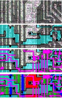 Крайние левые и крайние правые - как это выглядит в "безтранзисторных" кристаллах, поликремний выделен фиолетовым. В первом случае проводник явно подрезан, чтобы не было транзистора, во втором случае поликремниевого проводника нет вообще, и в этом месте топология немного отличается.