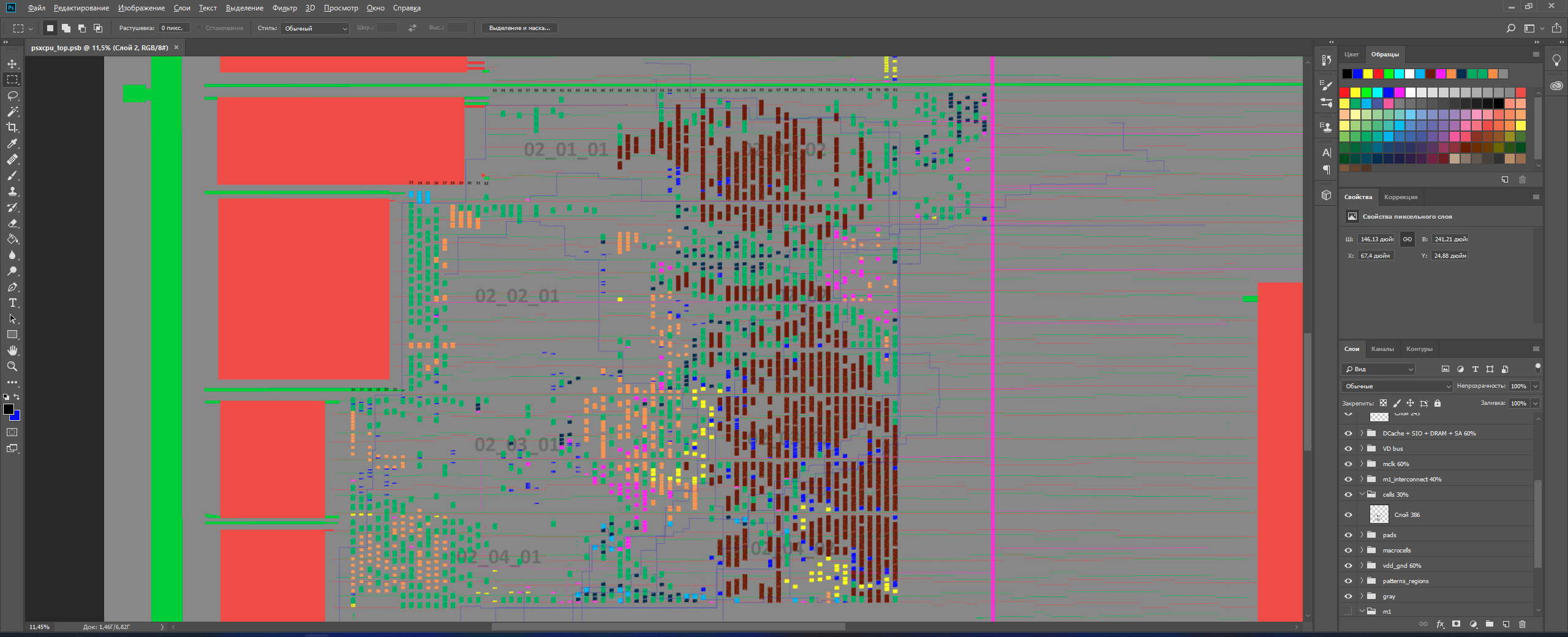 В плане реверса PSXCPU был большой застой (я хз сколько, может лет 10). На днях я решил применить вышеописанные методики и начать новый "бой". Текущая фаза -- формирование "черновой" топологии с ячейками. Сами ячейки были уже давно получены, просто находились в непрезентабельном виде. Настало время составить их полную карту (напоминаю - в PSXCPU примерно 37600 стандартных ячеек). Рабочий прогресс накидывания ячеек GTE ниже.