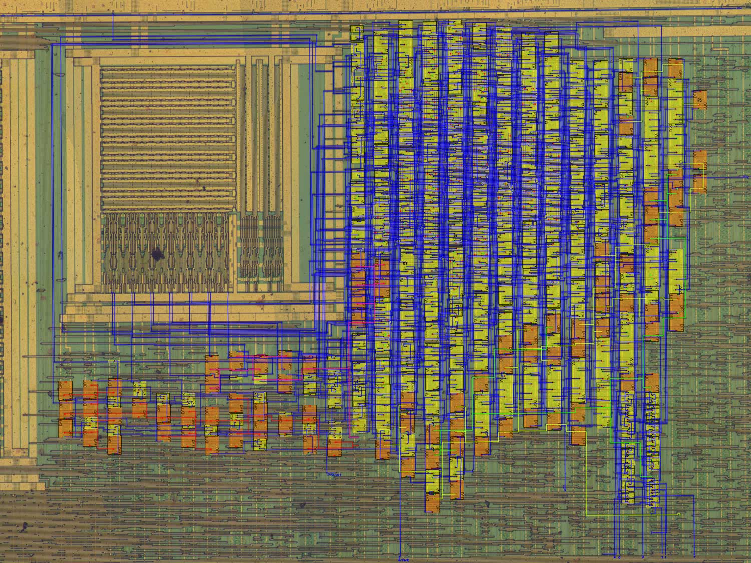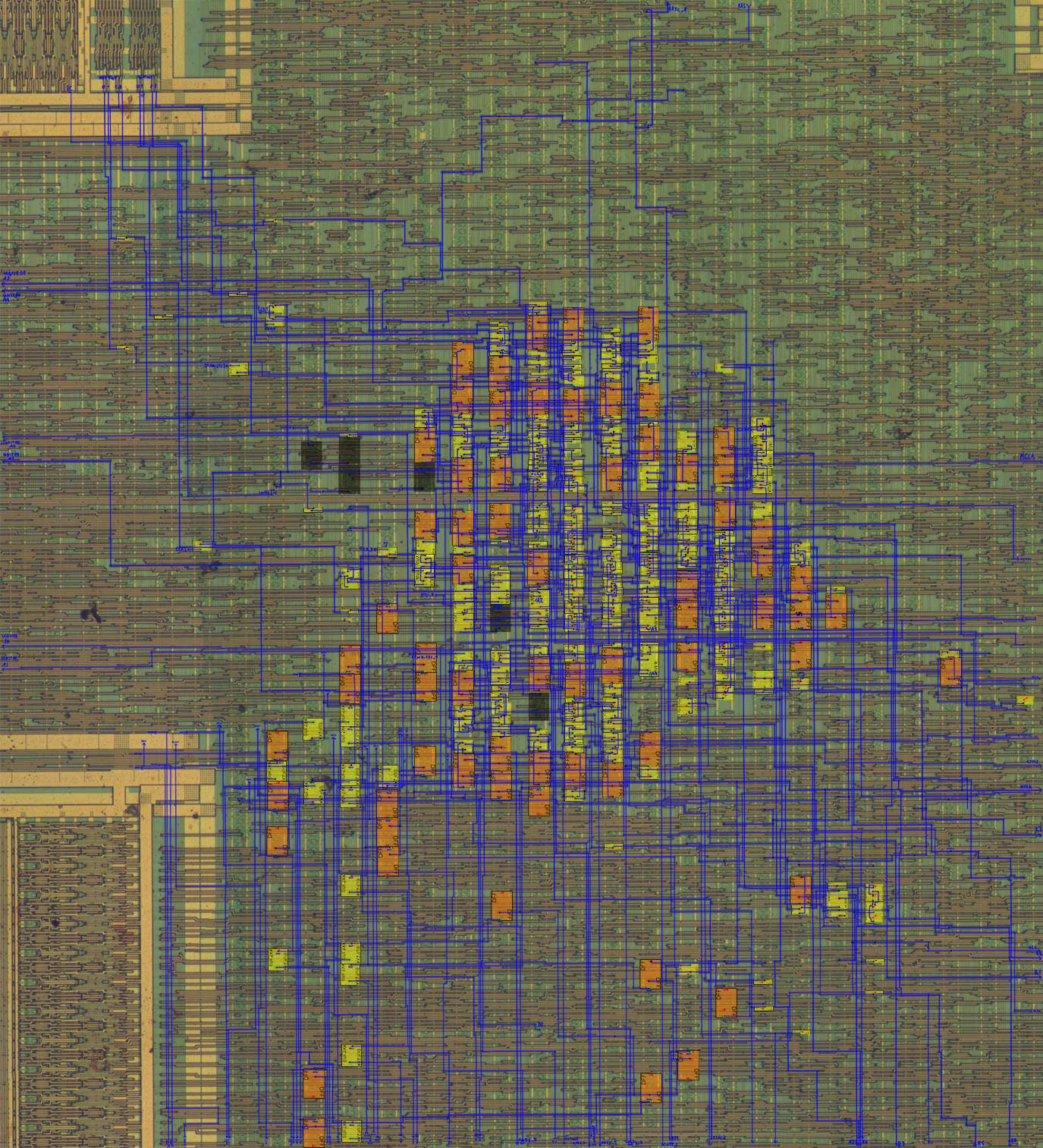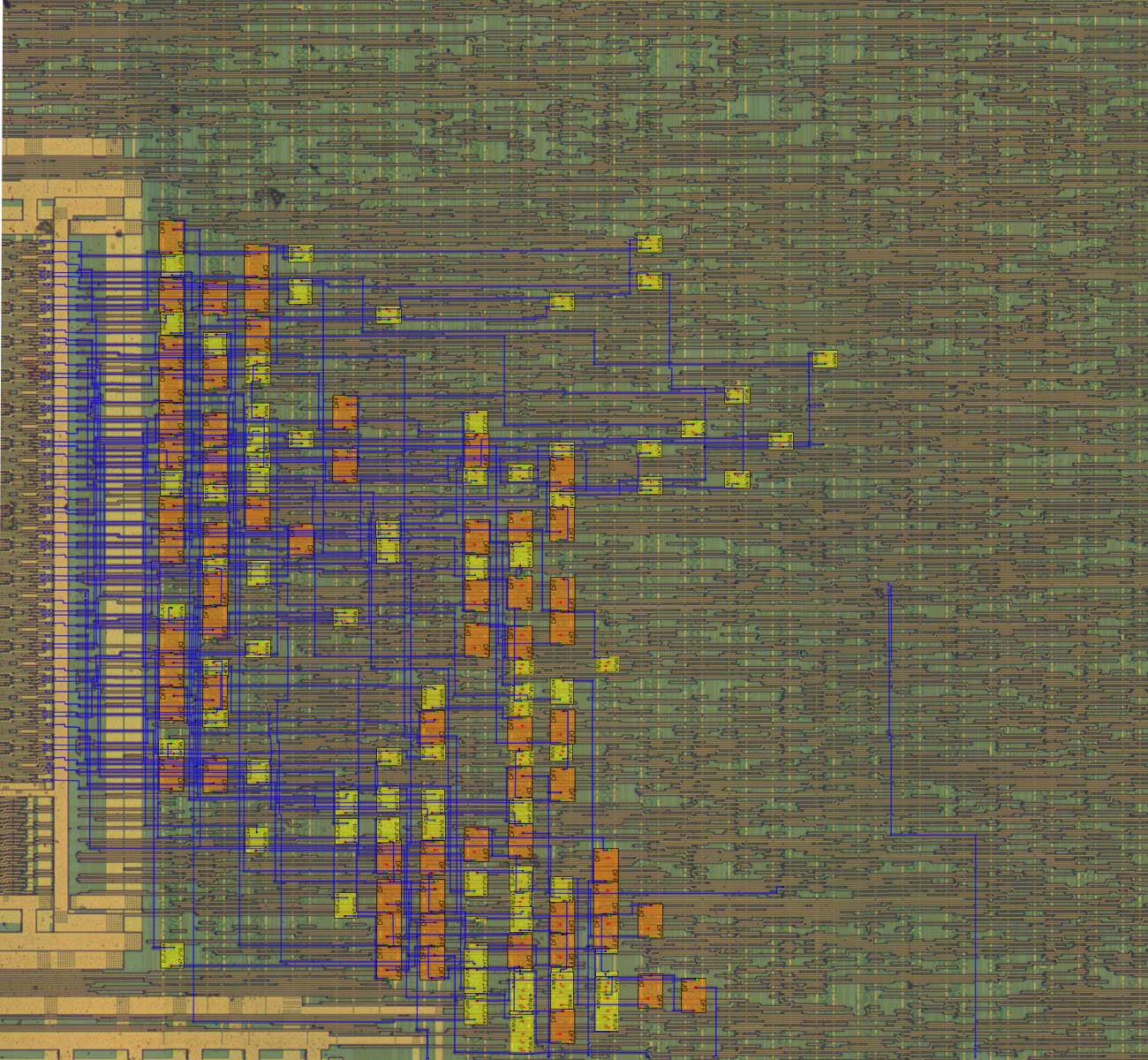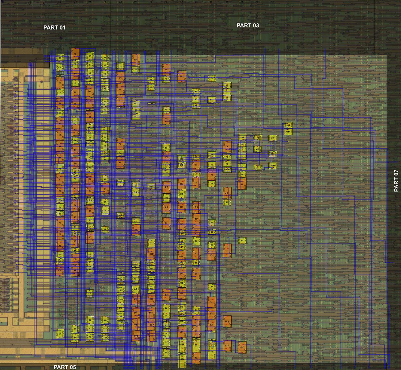| В раздел Скачать (http://psxdev.ru/download ) выложены склееные фотографии активного слоя PSX CPU. Исходные 9 ГБ ужались до 220 МБ     Теперь работать со стандартными ячейками стало гораздо удобнее. Следующей задачей является идентификация всех ячеек, параллельно ведется подсчёт их количества. В результате всего массив данных ужмется ещё сильнее и составит каких-то 100 КБ текста (тип ячейки + координаты) из которого можно будет сгенерировать любой участок процессора. Пример идентификации ячеек можно посмотреть тут : http://psxdev.ru/files/IC103/psxcpu_active_03_06.svg  (загружается не сразу!). Видно, что не все области хорошо просматриваются за пятнами грязи, эти участки мы восстановим потом, на базе фотографий М1 (которые тоже ещё предстоит сшить). PS. По стандартным ячейкам прогресс можно смотреть тут : http://wiki.psxdev.ru/index.php/CPU_CELLS