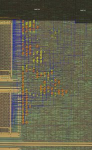 Закончил ряд выходов с юнита 04. Теперь мне кажется что это все-таки не Scale Table Matrix. Слишком уж непохожа работа с данными. Данные на все эти юниты как я и предполагал идут с юнита 03. Видимо юнит 03 является каким-то буфером (например буфером параметров) или дма буфером. С которого данные расходятся во всем всем местам. А какие данные использовать (то есть какому юниту отреагировать и записать в себя данные приходящие к нему на входы) определяет рандомная логика контролирующая процесс. Выходы с юнита 04 идут сразу не несколько наборов муксов, андов/норов и на триггера с инверторами. данные по всей видимости 8 бит. По крайней мере по 8 бит они приходят на муксы. на триггера приходят 10 бит, на инверторы 6. На норы идут первые 9 бит, на анды последующие 6 бит. Есть у кого-нибуть идеи что это может быть? =)  Ячейки в этот раз сосредоточены в основном в пятом блоке.