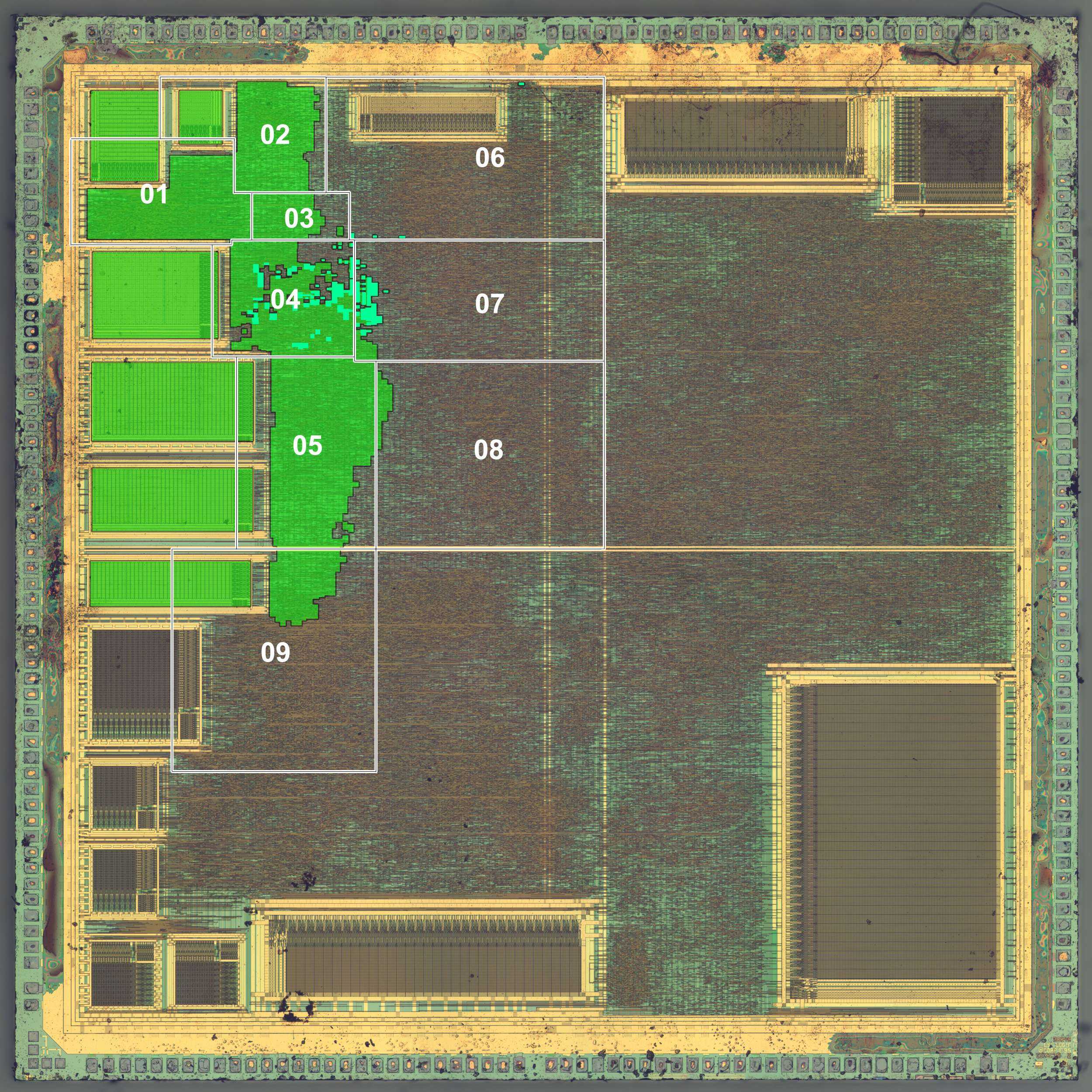 Долгожданные микросхемы денди. PPU: Цитата: Привет, Немало времени прошло, но руки начали постепенно доходить. Смотри/показывай тому, кто будет реверсить – если все отлично, травлю металлизацию и делаю второй снимок поликремния (а то пути назад-то не будет). http://s.zeptobars.ru/UMC-UA6538-HD.jpg