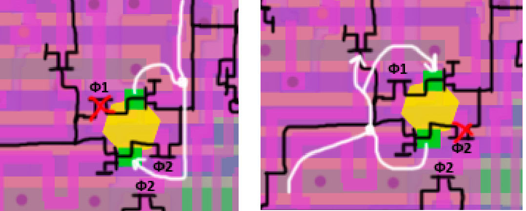 Там не общий сигнал управления. На один латч подается PHI1, на второй PHI2.