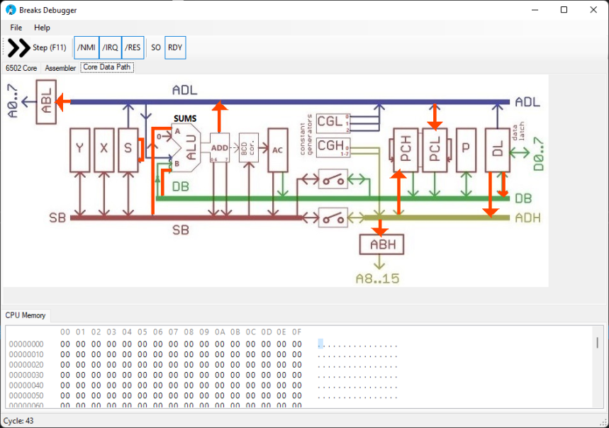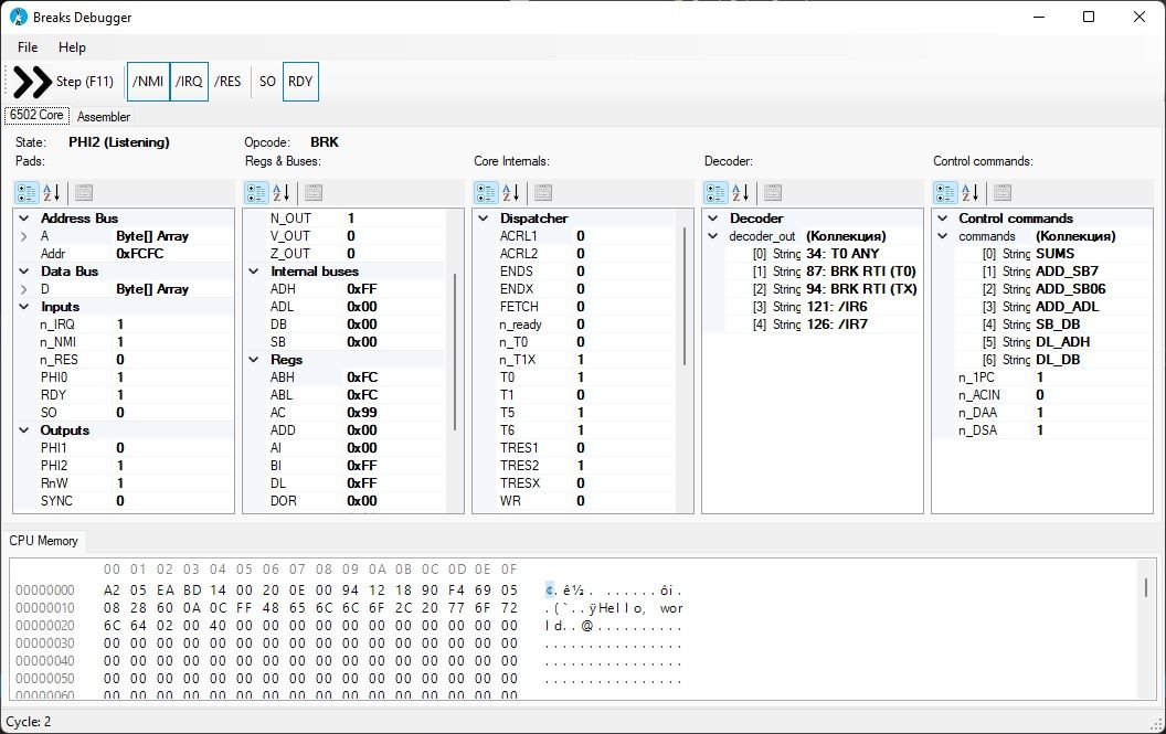 Будем считать финальная версия симулятора 6502: https://github.com/emu-russia/breaks/re ... s-debug-16Работают все инструкции (как мне кажется), прогнал TestAll.asm. Полёт нормальный. Есть поддержка юнит-тестирования. Создаете JSON с параметрами и дамп памяти/исходник на асме - скармливаете дебагеру, оно шуршит пока не встретит инструкцию BRK и выплевывет результаты (итоговый дамп памяти + res.json)