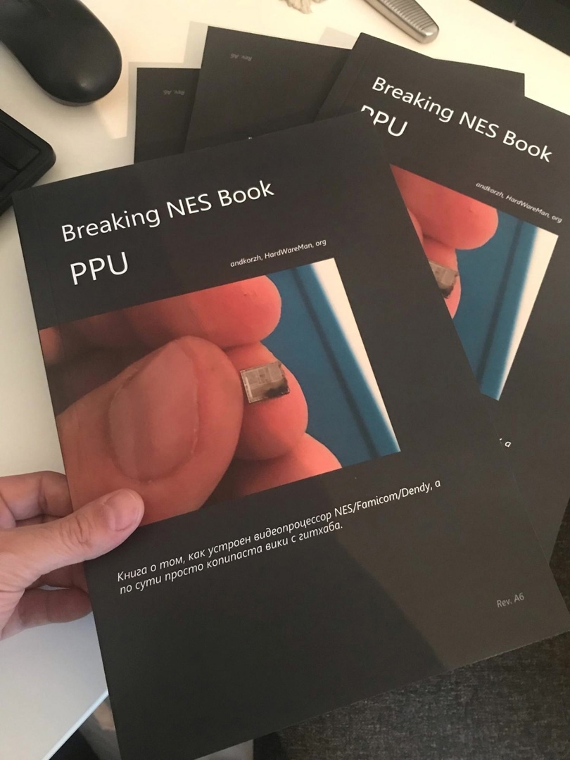 Случайно вспомнил про этот топик, напишу дайджест. С ноября 2021 года получив волшебный пинок от @andkorzh зарашили совместно с ним все логические схемы всех чипов NES: - https://github.com/emu-russia/breaks/tr ... 02_logisim- https://github.com/emu-russia/breaks/tr ... PU_logisim (базируется на схемах LogisimmerIK) - https://github.com/emu-russia/breaks/tr ... PU_logisimВыпустили 2 книги по 6502 и PPU: - https://github.com/emu-russia/breaks/re ... vA-russian- https://github.com/emu-russia/breaks/re ... A6-russianВскрыли PAL-версии чипов NES (RP2C07, RP2A07): - https://drive.google.com/drive/folders/ ... sp=sharing- https://drive.google.com/drive/folders/ ... sp=sharingПровели сравнение схем PAL и NTSC версий PPU. Результаты в релизах на нашем проекте GitHub/breaks. Сайт breaknes.com закрыт в пользу GitHub. Закончили заполнение вики по 6502 и PPU: - https://github.com/emu-russia/breaks/tr ... SWiki/6502- https://github.com/emu-russia/breaks/tr ... ESWiki/PPU- APU и книга по нему в процессе Разработан таки "Очень низкоуровневый эмулятор 6502" - Breaks Debugger: - https://github.com/emu-russia/breaks/re ... s-debug-10- https://github.com/emu-russia/breaks/re ... s-debug-11- https://github.com/emu-russia/breaks/re ... s-debug-12- https://github.com/emu-russia/breaks/re ... s-debug-13(просто все версии выкладываю, т.к. там описан процесс разработки) -- 15 янв 2022, 23:12 -- И ещё немного фоточек. -- 15 янв 2022, 23:15 --