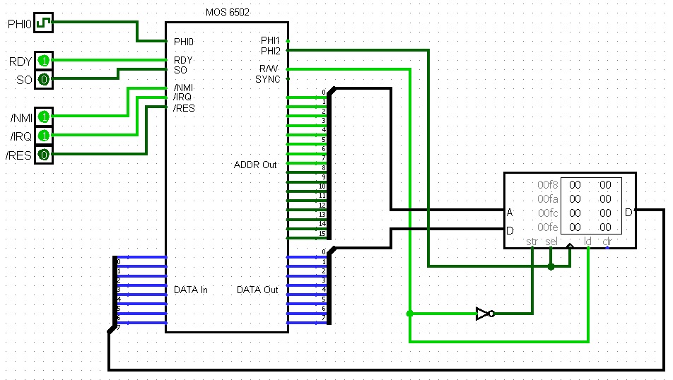 Завершена разработка схемы 6502 для Logisim: https://github.com/emu-russia/breaks/tr ... 02_logisimДля запуска симуляции: - Загрузить в RAM тестовую программу (прилагается visual6502.hex) - Установить RDY = 1, /NMI = 1, /IRQ = 1, /RES = 0 - Выполнить несколько циклов, пока 6502 не перейдет в режим ожидания /RES = 1 - Установить /RES = 1 Дальше процессор продолжит выполняться в обычном режиме. В начале будет инициирована BRK-последовательность сброса, затем он перейдет по адресу, указанному в векторе прерывания Reset и начнет выполнение демонстрационной программы. Схема содержит парочку workaround, в основном это касается двунаправленных шин, которые не поддерживаются в Logisim: - Все двунаправленные шины разделены на две (Bus In / Bus Out) - Специальная обработка команд SB/DB и SB/ADH, которые соединяют двунаправленные шины SB, DB и ADH (находится в схеме BUS_MUX_HACK) - Специальная обработка самого первого полуцикла, когда процессор "сходит с ума". В этом полуцикле нужно очистить все внутренние шины (находится в схеме PRECHARGE).