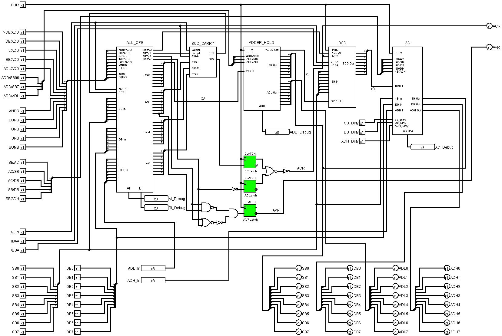 Для примера возьмем команду 01101101 (ADC ABS). Если верить Visual6502, то в определенный момент должен появиться сигнал ADD/ADL. Конкретно - в момент ф2 Т3 и ф1 Т0. В logisim-схеме этого не происходит. Более того, если верить Visual6502, то к ABS-адресации имеют отношение сигналы T2‑abs, T2‑abs‑access, T3‑abs/idx/ind и T3‑mem‑abs. Это D31, D83, D90 и D122. Влияние ни одного из них я не смог отследить явным образом до выхода ADD/ADL.