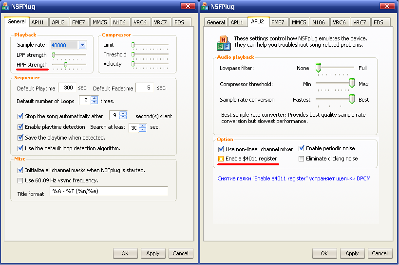 Я залил полную GAME NSF-коллекцию, пропатченную HWM'овской утилитой. Теперь вы можете использовать NSFplug/NSFplay в роли "истинного денди-плеера". Обнаружил наконец, как избавиться от неприятных щелчков DPCM. Также можно немного убрать бас HiPass фильтром, это уж на любителя. Я например, без такой эквализации слушать NSF не могу - бас треугольника уши режет. И не во всяком эмуляторе ведь HiPass реализован. Ползунок "Sample Rate Conversion" желательно выставить в BEST для каждого чипа.