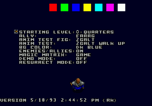 В Alien 3 на SMD на этапе разработки по адресу 0000F0 было слово "TEST". Игра проверяет его наличие дважды. Одна проверка связана с уже известным читом на пропуск уровня, т.е. в тестовой версии вводить код со 2го джойстика в опциях необязательно, можно сразу пользоваться кодом C,A,B в паузе. Вторая проверка связана с новой возможностью, которую без взлома получить невозможно (ну либо я не нашёл как). Итак вводим коды: