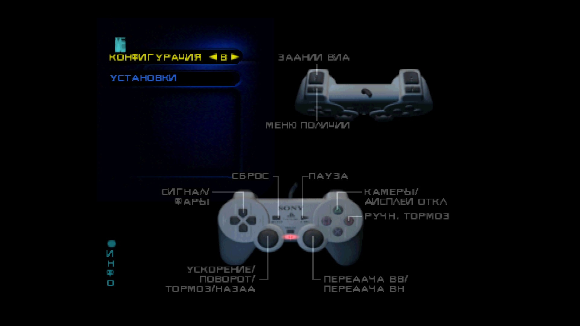 Разглядывать, какие там кнопки где и зачем на psx руле было лень, потому выбор пал на аналоговый контроллер в режиме "B". Управление влево/вправо осуществляется через левый стик влево/вправо, а газ и тормоз на левый стик вверх и вниз соответственно.