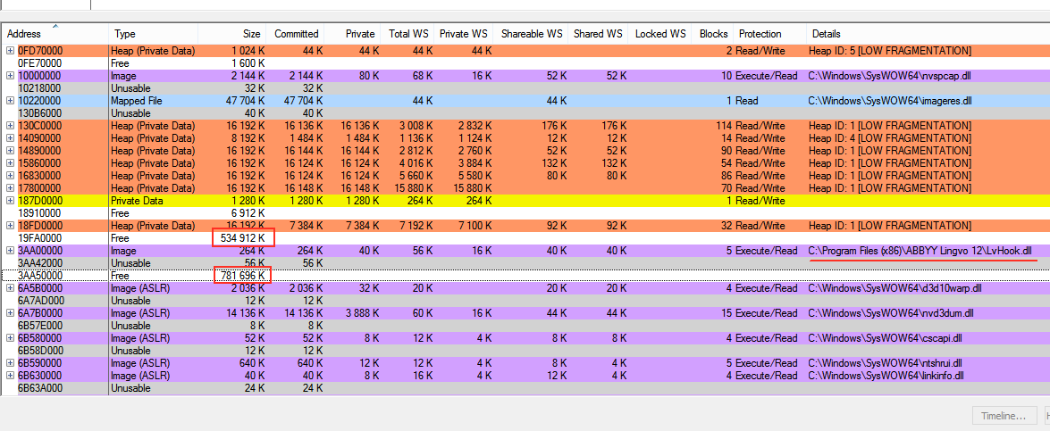 Тут можно наблюдать как словарь Lingvo нагло вторгся в чужой процесс, причём сделал это самым нахальным способом, разделив диапазон свободных адресов размером 1.2 G почти пополам: на блок ~534M и ~781M. Совершенно непонятно, почему он решил влезть именно в середину самого большого блока, но совершенно очевидно, что ещё парочка вот таких Lingvo посреди блоков 534 и 781 M и о запуске Demul можно забыть.