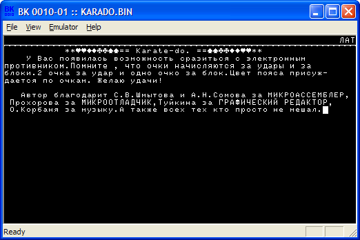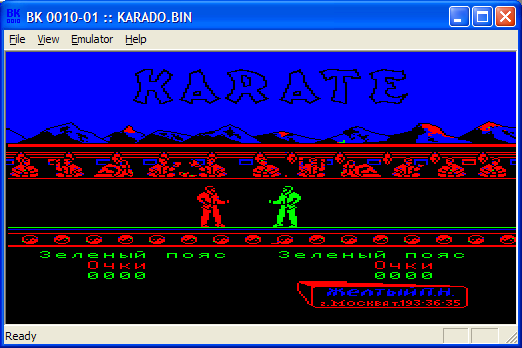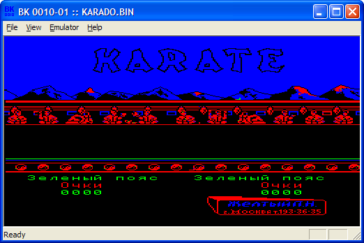 Сама игра зовется "KARATE", у меня на кассете зовется "КАРАТЕ-П.К.", у некоторых - "KARATE-DO" (текстовое сообщение до заставки у karate-do чуток другое, см. скрины).
