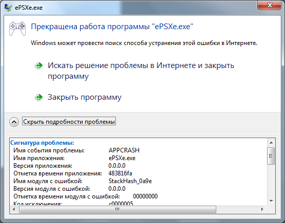 вот полностью Сигнатура проблемы: Имя события проблемы: APPCRASH Имя приложения: ePSXe.exe Версия приложения: 0.0.0.0 Отметка времени приложения: 483816fa Имя модуля с ошибкой: StackHash_0a9e Версия модуля с ошибкой: 0.0.0.0 Отметка времени модуля с ошибкой: 00000000 Код исключения: c0000005 Смещение исключения: 00000000 Версия ОС: 6.1.7601.2.1.0.256.1 Код языка: 1049 Дополнительные сведения 1: 0a9e Дополнительные сведения 2: 0a9e372d3b4ad19135b953a78882e789 Дополнительные сведения 3: 0a9e Дополнительные сведения 4: 0a9e372d3b4ad19135b953a78882e789 Ознакомьтесь с заявлением о конфиденциальности в Интернете: http://go.microsoft.com/fwlink/?linkid= ... cid=0x0419Если заявление о конфиденциальности в Интернете недоступно, ознакомьтесь с его локальным вариантом: C:\Windows\system32\ru-RU\erofflps.txt думаю из за него, с P.E.Op.S. Soft Driver 1.17 работает нормально, но смотриться апаснее чем с Pete's DX6/D3D 1.76, OpenGL 1.76 тормозит, а OpenGL2 2.7 не пашет твой плагин v0.34, игры ff 7&8, безуспешно пробовал удалить ini и в configure залезть не могу... Да я сам себе не доверяю  а можа тупо выложишь рабочую версию эмуля с твоим плагином?!)