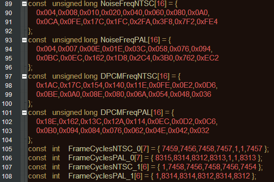 Посмотрел ещё раз source nintendulator. Нашел два интересных места в APU.cpp: - в первом указываются NTSC и PAL таблицы с высотой тона для DPCM и Noise. - во втором выбирается сам регион, с указанием, какую таблицу и частоту ЦП использовать. Теперь, если мы сделаем одно из двух: А) Просто заменим содержимое PAL-таблиц на NTSC. Б) Укажем для региона PAL таблицы NTSC, а содержимое самих таблиц оставляем нетронутым. то получим один и тот же результат - натуральный PAL-режим, с соответствующей (пониженной) высотой звука, но без дисбаланса со стороны DPCM. Если же у варианта "Б" ещё изменить значение частоты ЦП (строка 898) на 1773447, получим высоту тона денди. Только общая скорость игры/звука в таком случае возрастает до ~54 FPS. По поведению такой вариант всё равно остаётся PAL'ом: Battletoads'ы зависают. Надо найти, где в коде указывается главная частота ЦП, а также тайминги.