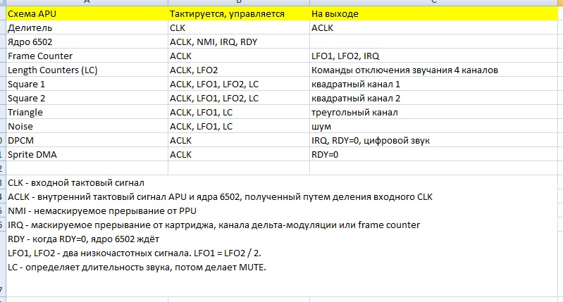 Что-то должно завершиться одновременно? Нет, я просто переделываю немножко звуковой движок, который использовался в Unchained Melody картриджах, чтобы звук на NES PAL / NES NTSC и Dendy был идентичным. Всё в принципе готово, но для шумового канала судя по всему используется length couner для задания продолжительности звучания. Вот я и хотел узнать, какие значения нужно передать для PAL версии, чтобы звук в итоге длился столько же, сколько он длится в NTSC/Dendy версии. Если частота этого счётчика привязана к частоте процессора, то здесь можно вычислить, что для PAL режима нужно указывать на 8% меньшее значение length counter. Поскольку эти значения выбираются из таблички, и для NTSC выбрано значение 1 (254 фрейма), то нам нужно выбрать значение для ≈234 фреймов. Но там в табличке есть только ближайшие варианты 192 и 254 фрейма, то есть точно указать значение не выйдет, и для идентичного звука придётся походу переписывать немножко звуковой движок, чтобы length counter не использовался вообще. Но мне вообще интересно, почему тут разработчики процессора использовали таблички? Может быть, в PAL и NTSC версиях эти таблички отличаются, и подогнаны так, чтобы продолижтельность звучания была одинаковой на PAL и NTSC, а в эмуляторе (Nestopia в моём случае) просто некорректная версия этой таблички.