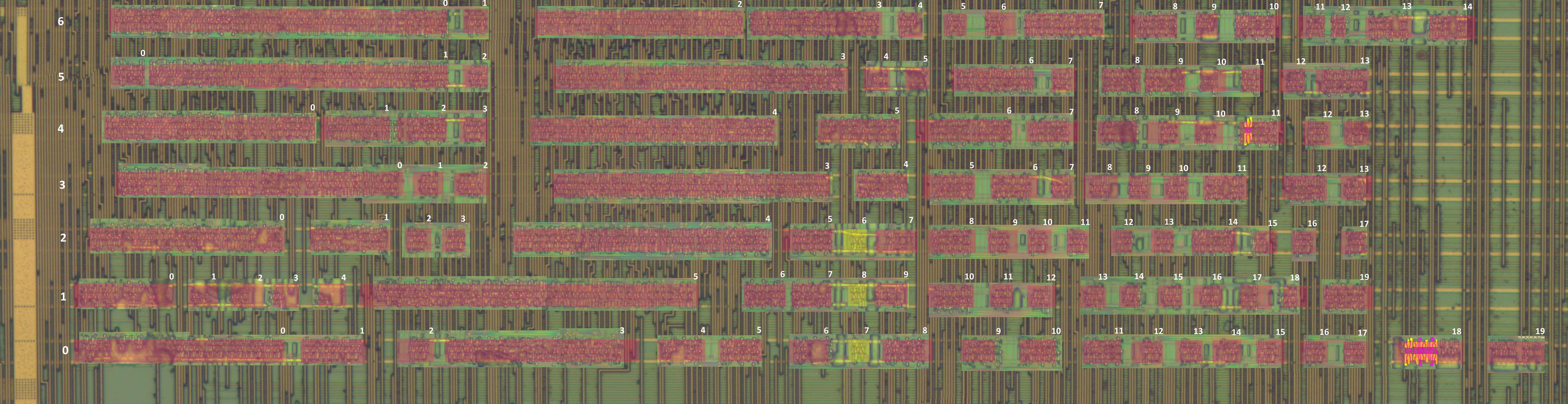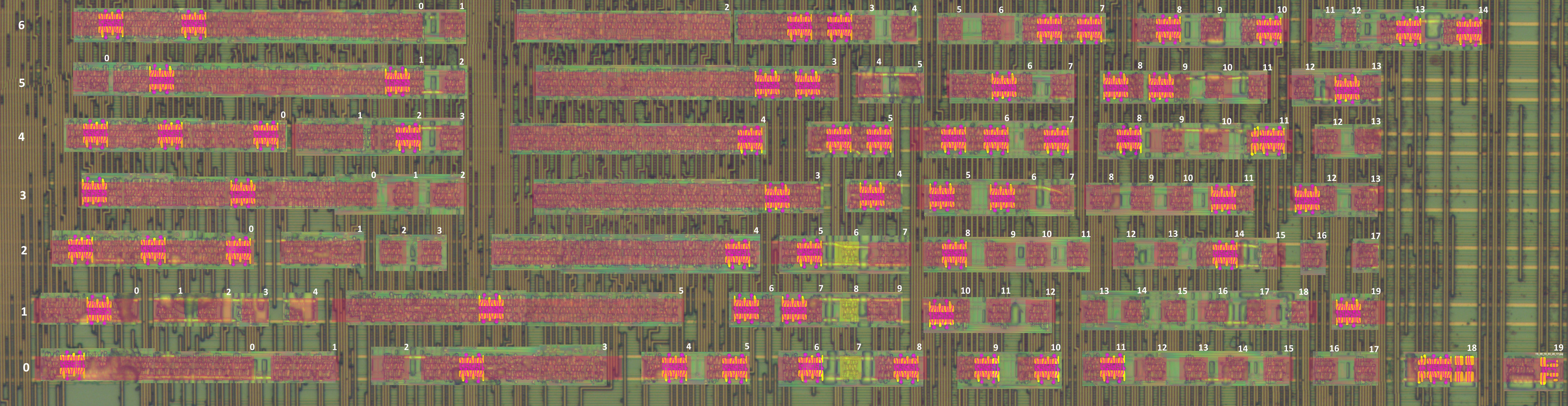 Оценили количество рядов :  итого 310. А тем временем я, используя свой колхозный метод совмещения слоев, решил попробовать восстановить блоки своего куска 2-4. Совместить точно не получается (по виасам) из-за искажений сведения картинок и другого увеличения (фотки металла делались на 20x, диффузия на 40x), но это вообще не представляет никаких проблем. Даже кучи грязи вообще не проблема. Блоки, почти по уши находящиеся в дерьме всё равно легко распознаются. Прилагаю 2 картинки, на одной я подготовил ряды (первые 7 рядов части 02), на следующей я методом copy-paste расклонировал одну из ячеек, которая как мы предполагаем является Full adder-ом.